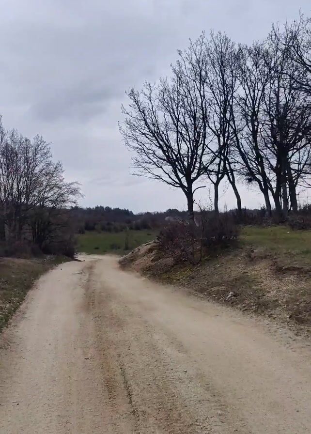 A dirt road stretches forward under a cloudy sky. The road curves slightly to the left and is lined with bare trees and sparse vegetation. In the distance, a green field is visible, bordered by a treeline. The road surface shows tire tracks.