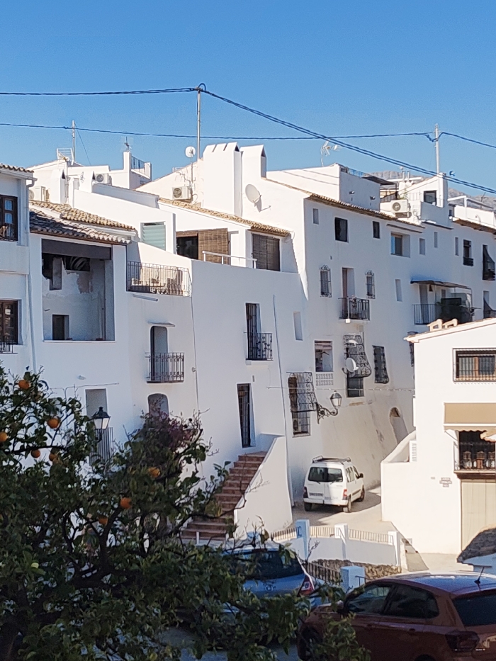 A sunny scene of white-washed buildings, typical of a Mediterranean village. The structures are multi-storied, with balconies and varying rooflines. A staircase leads up to a doorway. A white van is parked on the street. The sky is a clear blue. A tree, laden with oranges, frames the left side of the image, and parts of parked cars are visible along the bottom, partly obscured. Power lines crisscross above the buildings.