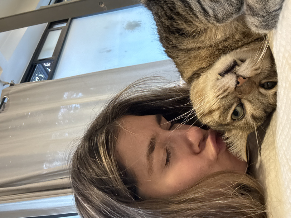 A woman with closed eyes and fair skin is lying down. Her brown and blonde hair is disheveled. A brown tabby cat is positioned upside down above her face, its whiskers brushing her. The cat's mouth is slightly open, exposing its teeth. The background includes a window with a metal frame and a sheer white curtain. The scene is brightly lit.