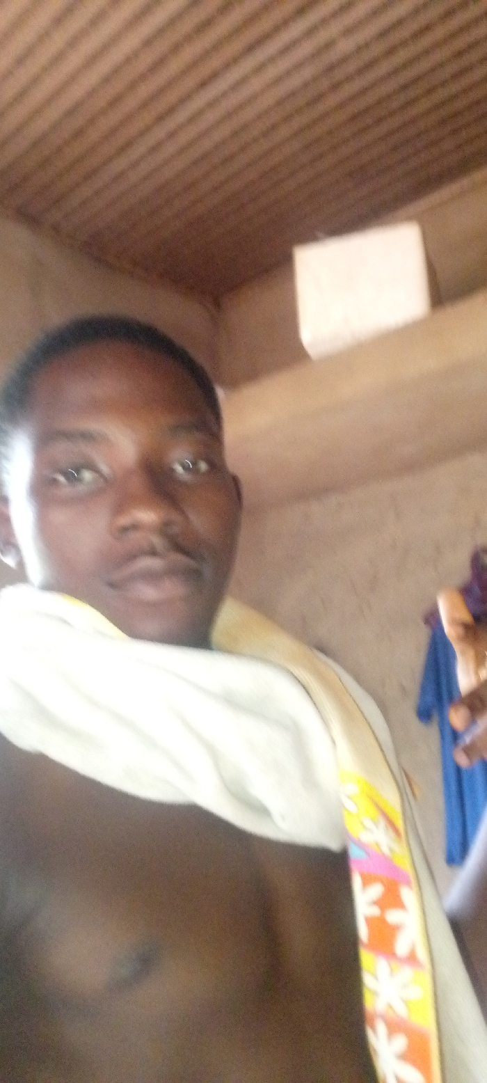 The image depicts a single adult male, positioned centrally, facing forward, from the chest up. He has dark skin and appears to be bare-chested under a light-colored garment, possibly white or off-white, draped over his shoulders. This garment features a vertical decorative strip on the right side, displaying white floral patterns on segmented backgrounds of orange, yellow, and possibly pink/blue. A light-colored stud or earring is visible in his left earlobe. The subject's right arm or hand is partially visible on the far right edge. The background shows an indoor environment. The ceiling is constructed from light brown wooden slats running diagonally from the upper left to the upper right. The walls are a light, earthy brown, appearing to have an uneven texture. On the right side of the frame, a rectangular, light-colored object, possibly a foam block or container, rests on a visible shelf or ledge. Below and to the right of this object, a blue garment hangs on the wall, partially visible. The scene is located inside a building within the city of Unknown, Unknown.