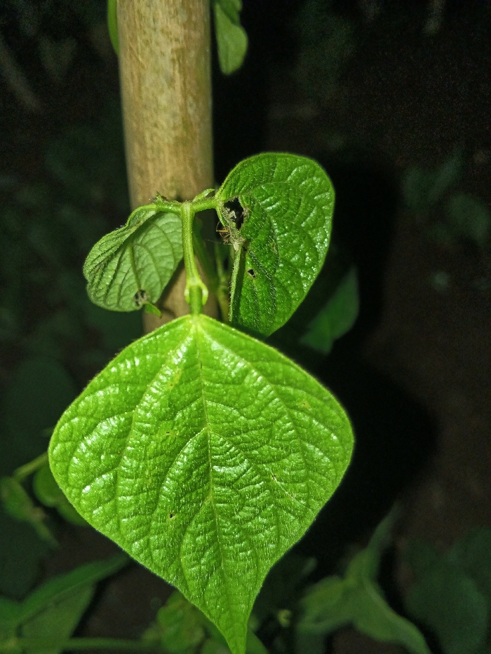 This close-up image, captured in Banteay Srei, Cambodia, presents a section of a vibrant green plant with several leaves and a supporting structure. A large, distinctively green, diamond-shaped leaf with a textured, puckered surface and visible venation occupies the lower central and right portion of the frame. Above it, two smaller, similar green leaves are visible, one overlapping the other, with minor irregularities or small perforations evident on their surfaces. A slender, light brown wooden pole or sapling trunk runs vertically along the left side of the frame, partially obscured by the foliage, providing support for the plant. A small, dark-bodied arthropod, possibly an ant, is observed on the underside or edge of the upper right leaf, near some fine, web-like material or debris. The background is dark and out of focus, indicating a shadowy or densely vegetated environment, with indistinct green forms faintly visible. The primary leaves are distinctly illuminated against the darker surroundings.