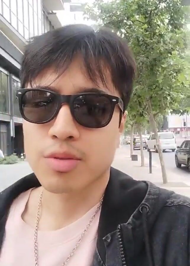 A young Asian man is filming a video of himself as he walks along a sidewalk near a street. He is wearing sunglasses, a pink t-shirt, a dark jacket, and a silver necklace with a round pendant. The sidewalks are empty, except for the occasional passerby. Tall buildings and trees are visible in the background. The man appears to be speaking into the camera.