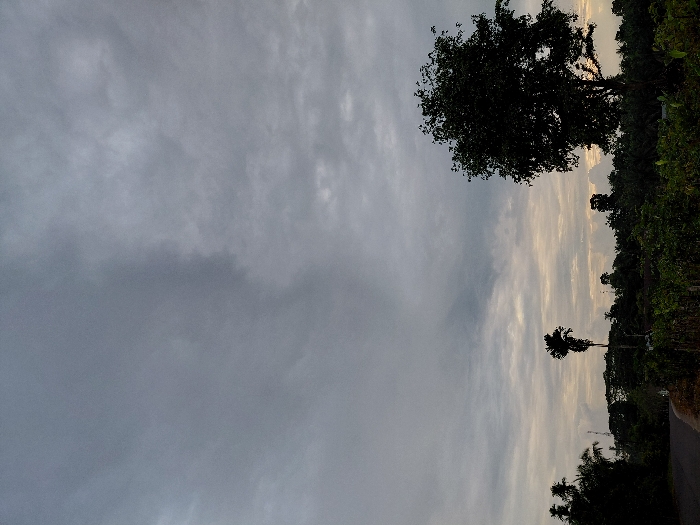 A rural scene unfolds under a cloudy sky. A dark asphalt road runs along the right, bordered by lush green vegetation and trees. A large tree with dense foliage dominates the upper right, silhouetted against a brighter band of sky peeking through the clouds. A tall, slender palm tree stands amidst the greenery, adding to the tropical feel. The sky, filled with thick, layered clouds, occupies most of the frame, suggesting either dawn or dusk.