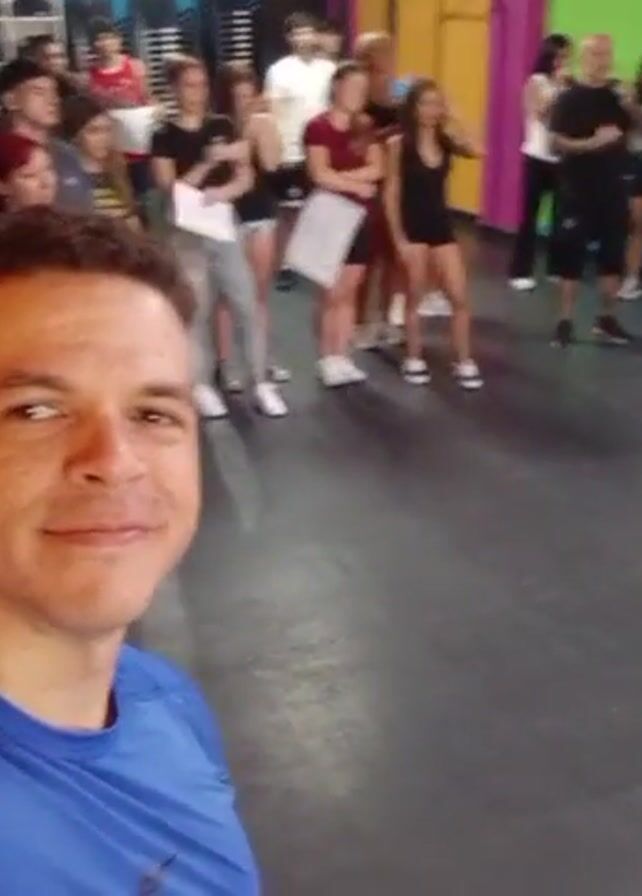A man takes a selfie in a dance studio, capturing a group of about twenty people behind him