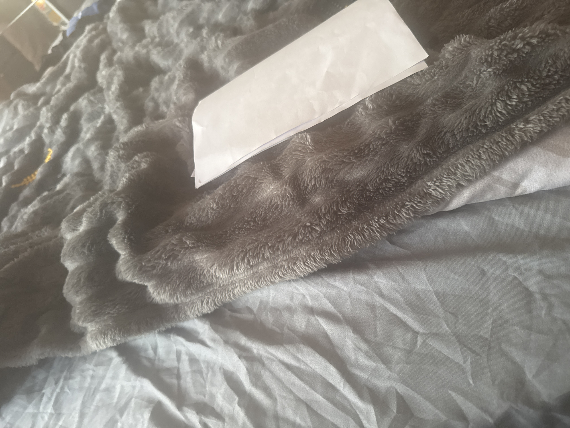 The scene is located in Simeonovgrad, Bulgaria. The image depicts an indoor environment focused on two juxtaposed textile surfaces. On the right and center, a dark grey, deeply textured, plush fabric object, likely a blanket or throw, is arranged with prominent folds and undulations. To its immediate left, a lighter grey, smooth fabric, possibly a sheet, exhibits multiple creases and wrinkles. Resting diagonally on the dark grey textured fabric, positioned from the upper right towards the lower left, is a single, rectangular white paper object, approximately 10-12 inches in length, consistent with an envelope or a folded document. No individuals are present, and no active interactions are observable. The lighting is diffuse, indicative of an interior setting.