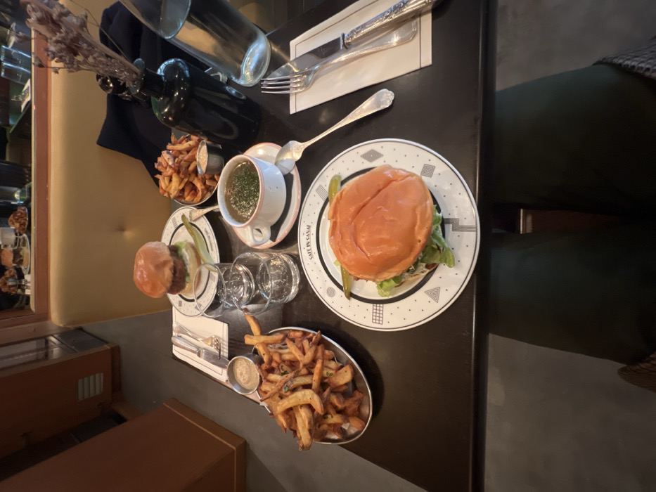 The image depicts a meal served on a dark-surfaced table within an indoor dining establishment identified by the plate text as "CAFÉ DE SENAÎ" located in Paris, France. On the table, two burgers are prominently displayed on round white plates featuring a black geometric Art Deco-style pattern, each accompanied by a gherkin spear. Two separate servings of golden-brown french fries are present: one in an oval metal dish alongside a small silver cup of white dipping sauce, and another in a round bowl further back. A white cup with a pink rim contains a dark liquid topped with green herbs, suggesting a soup or broth. Beverage service includes two clear glasses, each partially filled with water, and a tall clear glass water bottle. Silverware, including forks, knives, and a spoon, is arranged for dining. A dark, possibly black, glass vase containing dried brown flora stands on the right side of the table. The scene is viewed from the perspective of a diner, with the lower part of a person's legs, clad in dark green trousers, visible beneath the table in the foreground. In the background, a light yellow upholstered booth runs along a wall. Above the booth, a mirror reflects portions of the restaurant's interior, including what appears to be another dining area and possibly more food items. Wood paneling in a light orange-brown tone is visible on the left side of the background.