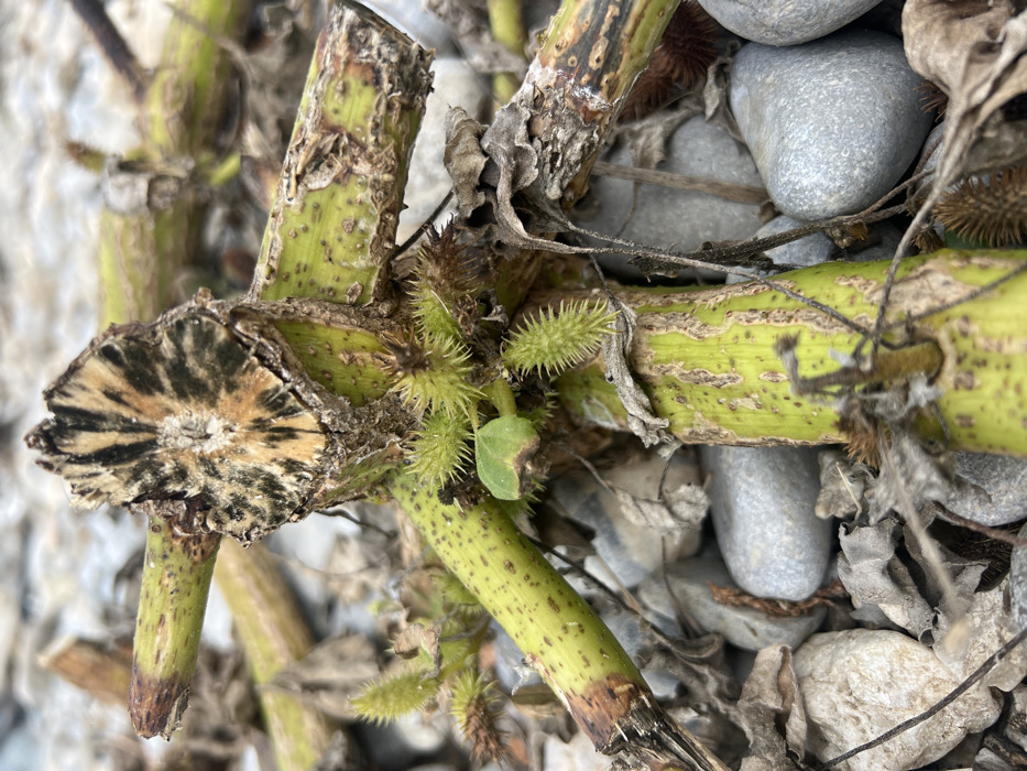 This close-up image depicts a prominent segment of a decaying plant stem resting on a ground composed of pebbles and dried organic matter, located in Vranjina, Montenegro. The central subject is a thick, light green plant stem, approximately 2-3 cm in diameter, exhibiting numerous small dark spots and larger brown areas indicative of decay or scarring. Its upper, severed end displays a distinct cross-section with a radial pattern of alternating dark brown/black and lighter tan-colored segments. Emerging from the main stem are several thinner, lighter green shoots, some bearing small, ovoid, spiky green seed pods or developing fruits, each approximately 1-1.5 cm in length. A single small, heart-shaped green leaf is also present near these growths. The ground beneath and around the stem consists of numerous smooth, rounded stones or pebbles, predominantly grey and off-white, varying in size from approximately 2 to 5 cm in diameter. Interspersed among the stones and plant parts are crumpled, dry brown leaves and other plant debris. Additional fragmented plant stems are visible in the blurred background, suggesting a natural outdoor environment. No people or animal subjects are present, and no actions or interactions are depicted.