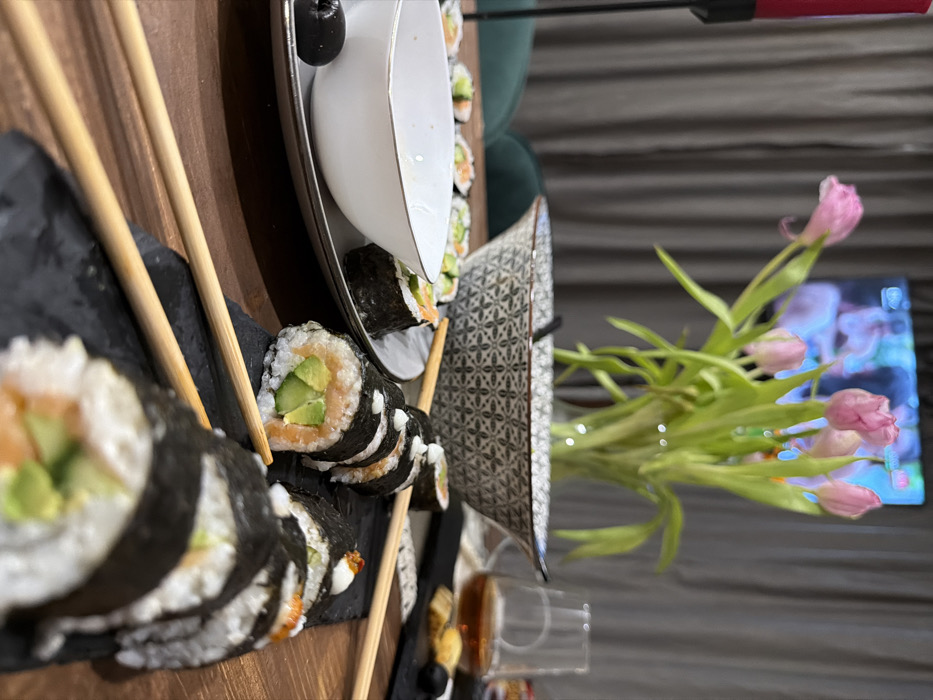 An indoor scene in Mezdra, Bulgaria, depicts a meal set on a dark wooden table. In the foreground, multiple pieces of sushi rolls are arranged on a dark, slate-like serving board, with additional rolls on a white oval plate. The sushi rolls contain salmon and avocado, wrapped in nori and rice; some are topped with a white sauce or cream, and others show orange roe. Several sets of light-colored wooden chopsticks are positioned across the sushi. A small white rectangular bowl with a gold rim, likely for dipping sauce, sits on the white plate, alongside a single black olive. A larger, patterned serving bowl with a geometric design (black and white) containing a dark spoon is centrally located on the table, resting on a woven placemat. To the right, a clear glass holding an amber-colored liquid is visible, next to a second dark serving board with yellow/gold appetizers. In the background, a vase containing several pink tulips with green stems and leaves stands behind the patterned bowl. Further back, a television screen displays a blurred image, and dark gray curtains are visible behind it. A red candle in a black holder is partially visible on the far left. A green upholstered chair or sofa is partially visible on the left side of the table.