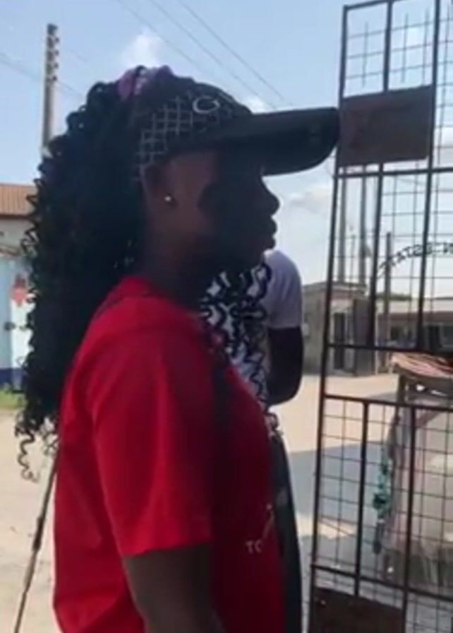 woman wearing a red shirt and a black visor, with black makeup on her face, standing on a street. A man in a white t-shirt and gray sweatpants walks past her, talking. The street is paved and there are buildings and utility poles visible in the background.