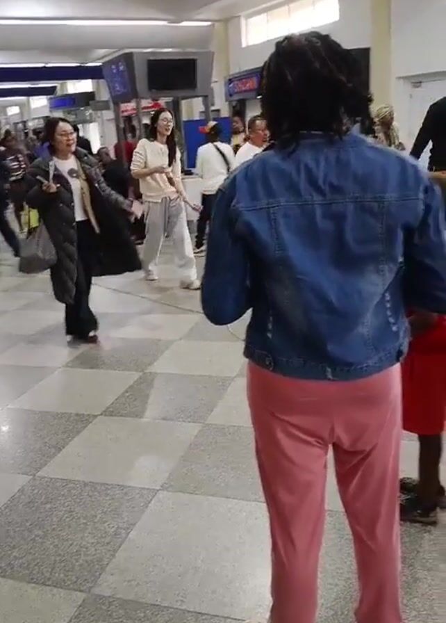 The video depicts a group of people inside what appears to be an airport or a large public space with a checkered floor