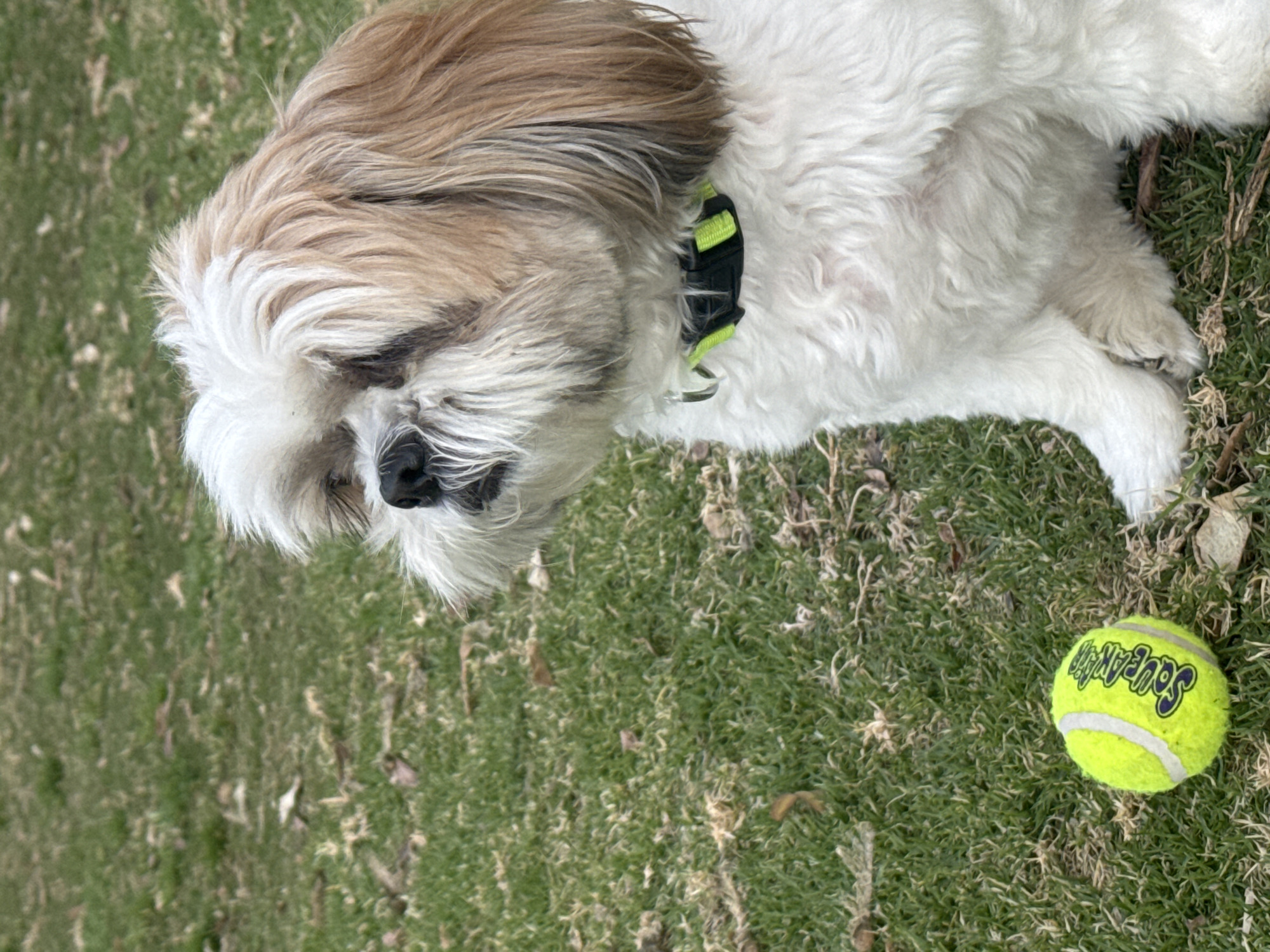 A medium, high-angle shot depicts a Shih Tzu dog lying on a lawn, with a bright yellow tennis ball nearby