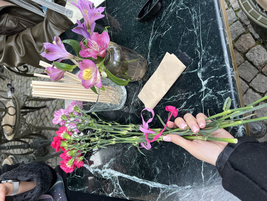The image presents a close-up, downward perspective of an outdoor cafe table in Sofia, Bulgaria. A light-skinned female hand, with manicured nails featuring white tips, holds a bouquet of approximately ten green-stemmed carnations, predominantly pink and fuchsia, secured by a vibrant pink curly ribbon. The bouquet is positioned over a dark green marble tabletop exhibiting prominent white veining. To the right of the hand and bouquet, on the same table, a clear, ribbed glass vase contains a small arrangement of pink and purple Alstroemeria flowers. Adjacent to the vase, a clear glass tumbler with a patterned base holds numerous light-colored wooden or bamboo drinking straws. A folded beige paper napkin rests flat on the table, situated between the carnations and the vase. A pair of black-framed sunglasses is partially visible on the far right edge of the table. The background, rendered out of focus, reveals a cobblestone pavement beneath the table and portions of other outdoor cafe furniture, specifically ornate dark-colored metal chairs and tables. Fragments of two individuals are also discernible at the table: one wearing a brown leather jacket in the upper right, and another person with a dark garment and a silver watch on their left wrist in the upper left.
