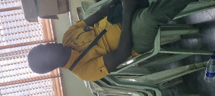 An indoor scene depicts a male individual seated in a light-colored plastic chair, looking to the right of the frame. He is dark-skinned, with his face largely obscured by shadow due to backlighting. He wears a mustard yellow short-sleeved collared shirt with buttons on the rolled-up sleeves, dark grey or olive trousers, and a black cross-body bag draped over his left shoulder. A small dark circular object is clipped to his shirt's front placket or pocket area. His hands rest in his lap. To his immediate left, a stack of identical light-colored plastic chairs is visible. The floor is tiled with large, dark square tiles. In the background, a window with horizontal wooden or plastic blinds allows bright natural light into the room. Above the window line to the right, a brown cardboard box is visible on an elevated surface. A clear plastic water bottle with a blue cap lies on the floor near the bottom left corner of the image. The specific location within Ikeja, Nigeria, is not discernible from the visual information provided. The setting appears to be a communal indoor space, possibly a waiting area or hall.