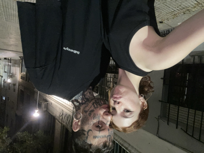 Two individuals are depicted outdoors at night on a city street in Buenos Aires, Argentina. A young adult female with reddish-brown curly hair, multiple ear piercings, and a septum piercing, wearing a black tank top, is positioned on the left, looking towards the camera with pursed lips. Her right arm and shoulder are visible. To her right, a young adult male with extensive facial and neck tattoos, including text ("MAMMA", "1112") and intricate designs, and large ear gauges, is visible in profile, facing towards the female. He wears a loose-fitting black t-shirt with "Bulberry™" printed in white on the chest. The male's face is in close proximity to the female's, suggesting an intimate interaction or pose. The background shows a narrow urban street illuminated by streetlights, with multi-story buildings featuring barred windows and balconies, consistent with Buenos Aires architecture. An air conditioning unit is visible on a building wall. The ground appears to be a concrete sidewalk. The overall scene is dimly lit, indicating nighttime conditions.