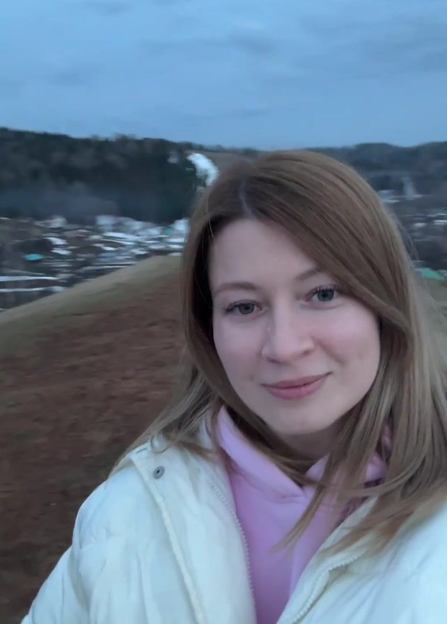 A woman in a white jacket and pink hoodie takes a selfie video while standing on a hill