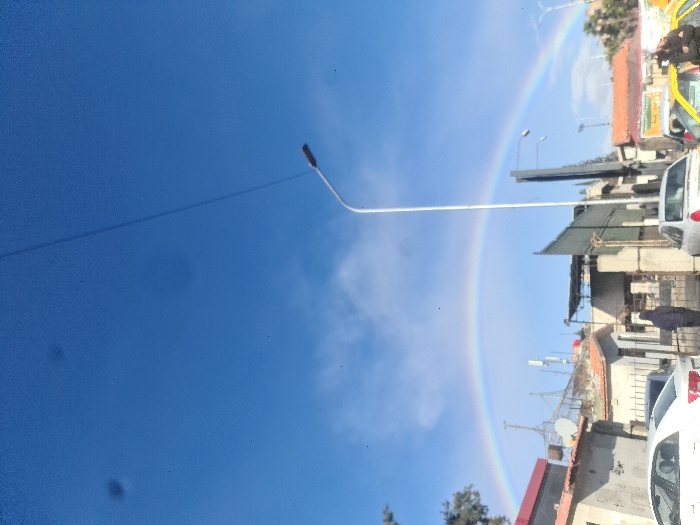 The image depicts an urban street scene in Barza Municipality, Syria, under a clear blue sky with scattered white clouds. A prominent and vibrant full rainbow arches across the middle ground, spanning from the left to the right side of the frame, indicating recent precipitation. In the foreground and mid-ground, multiple vehicles are present, mostly facing away from the viewer. These include a white sedan partially visible on the far left, another white sedan centrally positioned, and a yellow taxi cab partially visible on the far right. The environment consists of various low-rise buildings with flat or slightly pitched roofs, constructed from concrete or stucco. Several rooftops feature satellite dishes and communication antennas. A tall, silver-colored street lamp post with a black fixture stands vertically in the center-right of the image. An overhead utility line or cable is visible diagonally across the upper-right portion of the sky. Two individuals are discernible. One person, wearing a dark hooded jacket, is seen walking or standing in the central-left area, between the two white sedans, with their back to the viewer. Another person, dressed in dark clothing, is partially visible in the lower right corner, adjacent to the yellow taxi. The overall scene captures a moment of a natural phenomenon over an active urban setting.