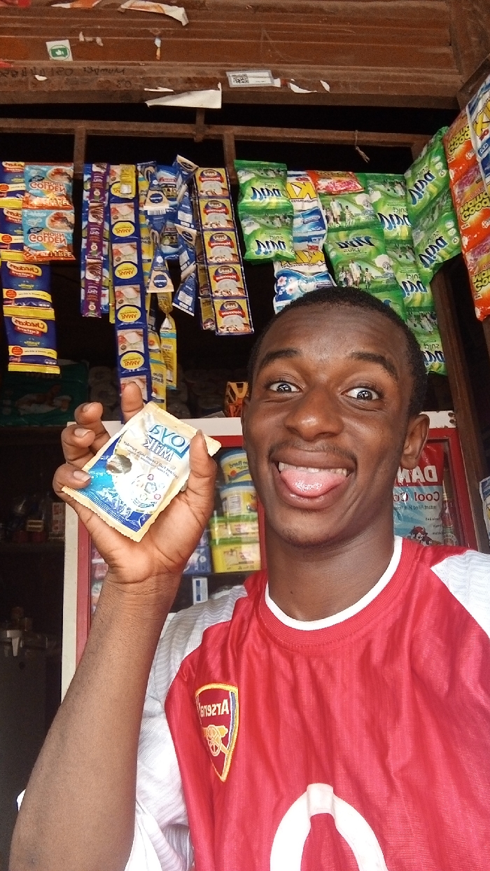 A young Black male is depicted in a close-up, mid-shot within what appears to be a small retail shop or kiosk in Onitsha, Nigeria. He holds a rectangular, light-colored sachet labeled "OVAL MILK" with blue and white graphics in his left hand, extending it towards the viewer. His face exhibits a playful expression with wide eyes and his tongue extended from an open mouth. He wears a red and white sports jersey, specifically an Arsenal Football Club shirt, with the crest visible on his left chest. The background consists of densely packed merchandise, including numerous small sachets of various products like "GOLDEN," "AMAR," and "DINA" brands, hanging from metal grids or strings against a wooden structure. A partially visible display unit or refrigerator behind him contains additional packaged goods.