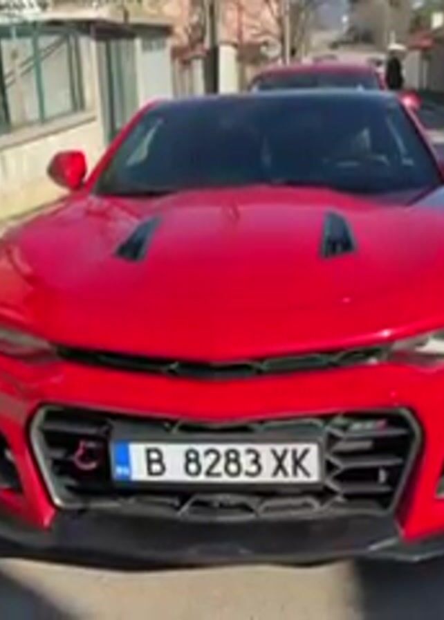 red Chevrolet Camaro parked on a residential street. The car is facing the camera, and its license plate reads "B 8283 XK." A green metal fence is visible on the left side of the frame, with houses and trees in the background. The street appears to be paved. The car starts, but only the front of the car remains visible.