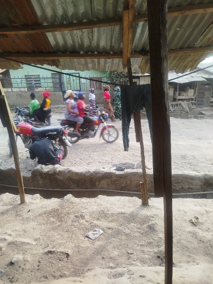 A dusty street scene unfolds under a corrugated roof. Several people are on motorcycles, with one person working on a red bike. Other people are walking in the background. A pair of pants hangs on a wooden structure that supports the roof. A low concrete barrier separates the foreground from the street, and trash litters the sandy ground. Adjacent buildings are visible, adding depth to the scene.