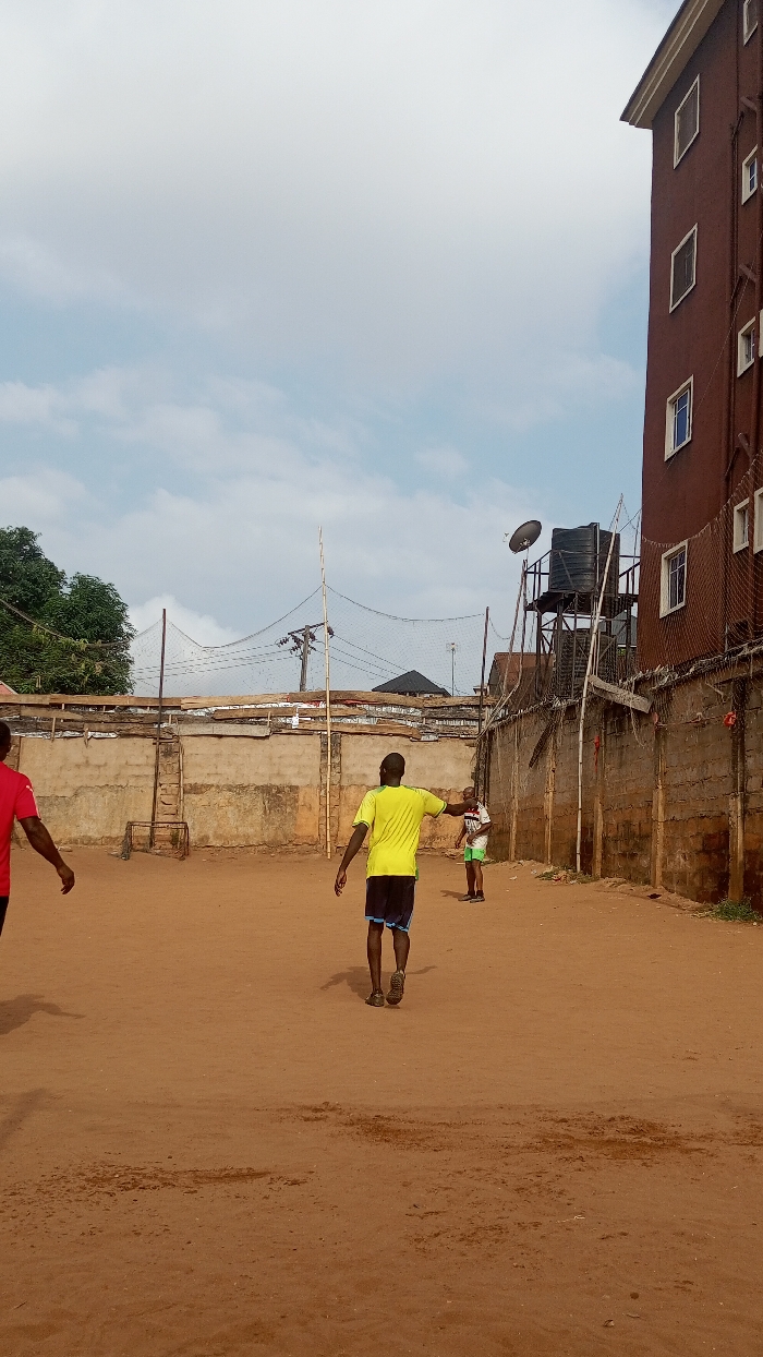 The image depicts an outdoor, unpaved sports court situated in an urban area within Onitsha, Nigeria