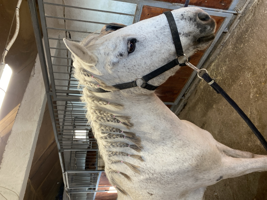 A light grey horse with a speckled or fleabitten coat stands within a stable in Podlastva (Poljice), Montenegro. The horse's mane is intricately braided into multiple short, individual plaits, each secured at the end with a small pink elastic band. It wears a black nylon halter with metal rings, to which a black braided lead rope is attached, extending downwards out of the frame. The horse's dark eye is visible. The immediate environment consists of the interior of a stable, featuring metal-barred stall fronts with lower wooden panels in the background. A dark-coated horse is partially visible within a stall further back. The ceiling is composed of light-colored wooden beams and panels, with a long fluorescent light fixture mounted overhead. The stable floor is covered with a layer of packed dirt or fine bedding material.
