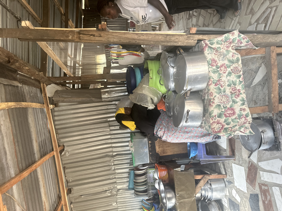 This image depicts a semi-enclosed cooking and preparation area in Jos, Nigeria, characterized by corrugated metal sheet walls and an overhead wooden beam framework
