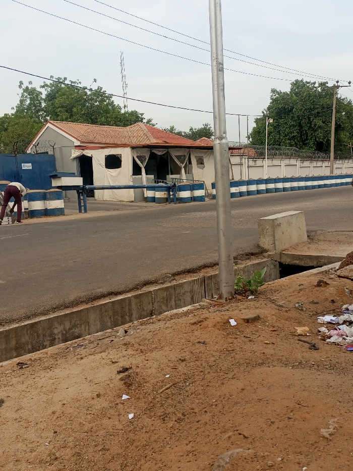 street in Maiduguri, Nigeria, located at coordinates 11.819 latitude and 13.157 longitude. The street is paved with asphalt and bordered by a concrete curb and a dirt shoulder. A single, tall, metal light pole stands on the dirt shoulder. A concrete storm drain runs alongside the curb. There is a small pile of trash on the shoulder, including paper, plastic, and cloth. In the background, there is a building with a red tile roof and a white exterior. The building is surrounded by a chain-link fence topped with barbed wire. A metal barrier is in front of the building, and a man in red pants and a brown shirt is walking away from the barrier. There is a row of blue and white barrels in front of the fence. There is a sign on the building that says "Nigeria." The trees in the background have lush green foliage. The sky is cloudy. The image is taken from a low angle, looking towards the building.