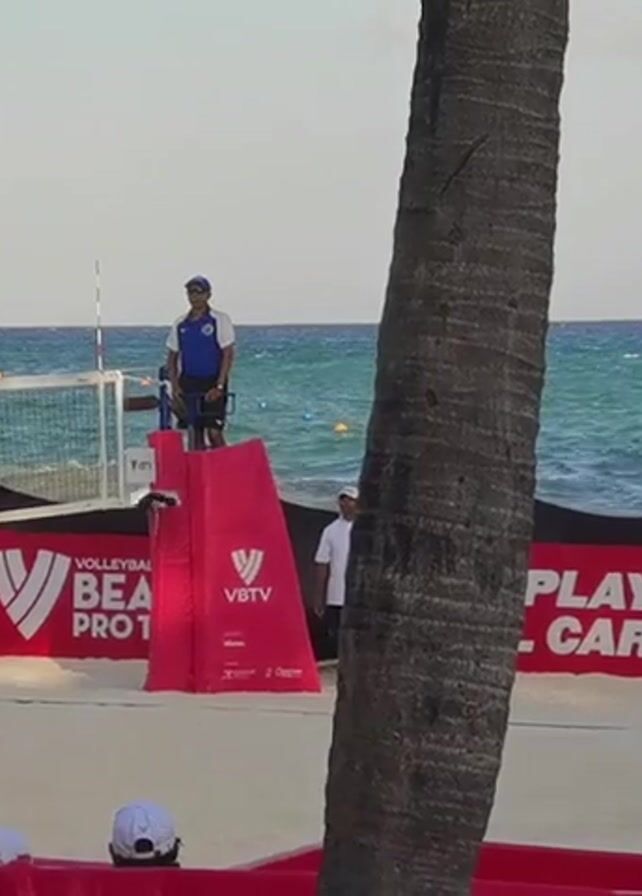 beach volleyball match in progress on a sunny day at a beach. Visible in the background is the ocean, which has a slightly choppy texture. A referee, dressed in a blue vest and hat, stands elevated on a red platform adjacent to the net. Two teams are actively playing. One team wears yellow jerseys with visible numbers on their backs and the other team wears green jerseys. Surrounding the court are red banners with white text and logos, including “CONADE” and “VOLLEYBALL BEACH PRO.” The court is sandy. A palm tree trunk is in the foreground, partially obscuring the view.