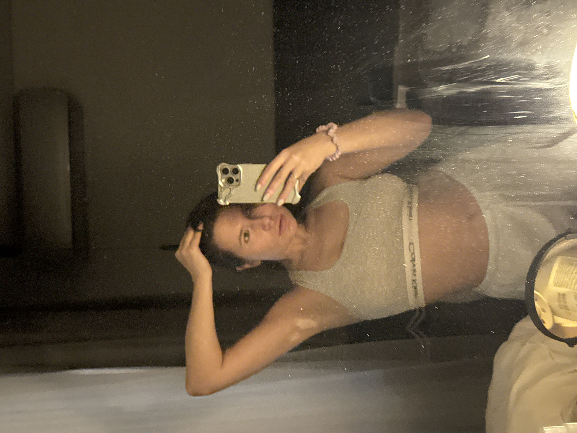The image depicts a female subject captured in a mirror selfie within an indoor setting, identified as Vnukovo, Russia. The subject is seen from the mid-torso upward, adjusting her dark hair with her raised left hand. She is wearing a light-colored athletic or bralette-style top with "Calvin Klein" visible on the band, and light-colored bottoms are partially visible below the top. Her right hand holds a gold/beige iPhone, equipped with a multi-lens camera module, enclosed in a matching case. A light pink beaded bracelet is present on her right wrist. The subject's left upper arm displays areas of lighter skin pigmentation. The mirror surface is speckled with numerous small droplets or dust particles. Reflected in the background are a wall-mounted air conditioning unit positioned above the subject's head and light-colored curtains to the left. A small, circular mirror is visible in the lower foreground. The overall ambient lighting appears subdued.