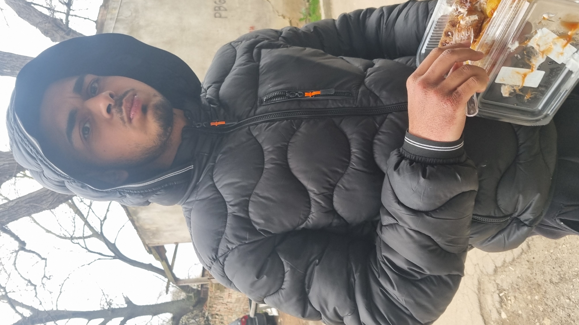 A young male individual is depicted outdoors in Dolni Chiflik, Bulgaria. He is seen from the chest up, facing the viewer directly with a neutral expression. He wears a black hooded puffer jacket featuring a distinct wavy quilted pattern and a central zipper with orange pull tabs. The jacket's left cuff has two thin white horizontal stripes. The individual has short dark hair and facial stubble on his chin and upper lip. His right hand holds a transparent plastic container, partially consumed, which contains remnants of fried meat and potatoes, along with white paper fragments and sauce residue. The background reveals an overcast sky and the bare branches of a large deciduous tree. Behind the tree, a light-colored building with exposed wooden structural elements is visible. To the right, a light-colored wall or building surface displays faint dark lettering, including "PBG." The ground surface is light-colored and uneven, consistent with dirt or gravel. A dark vehicle and a low, light-colored structure are partially visible in the far-left background.