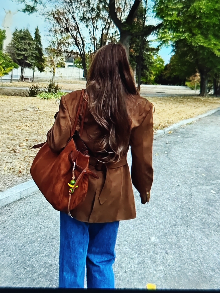 A solitary individual, viewed from behind, walks right-to-left on a grey paved path in the city of Unknown, Unknown. The person has long, wavy brown hair and is dressed in a brown, belted, suede-like jacket and blue denim jeans. A large, brown, slouchy hobo-style bag, adorned with a decorative keychain featuring green and yellow beaded elements and a brown tassel, hangs from the left shoulder. The path is bordered by a dark curbstone and an area of dried, light brown grass with some green ground cover. The background consists of numerous deciduous and evergreen trees, some with full green foliage and others with sparser, lighter leaves or bare branches. In the distant left background, a white structure, possibly a wall or building, is visible, and above it, an indistinct white, statue-like figure, resembling a religious monument, stands against a light blue sky.