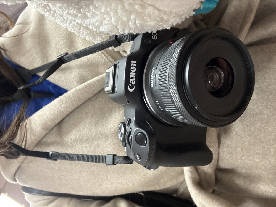 - "The image presents a close-up, chest-level view of an individual carrying a black Canon EOS mirrorless camera, fitted with an 18-45mm zoom lens" by FM-Gswv13, licensed under CC BY 4.0