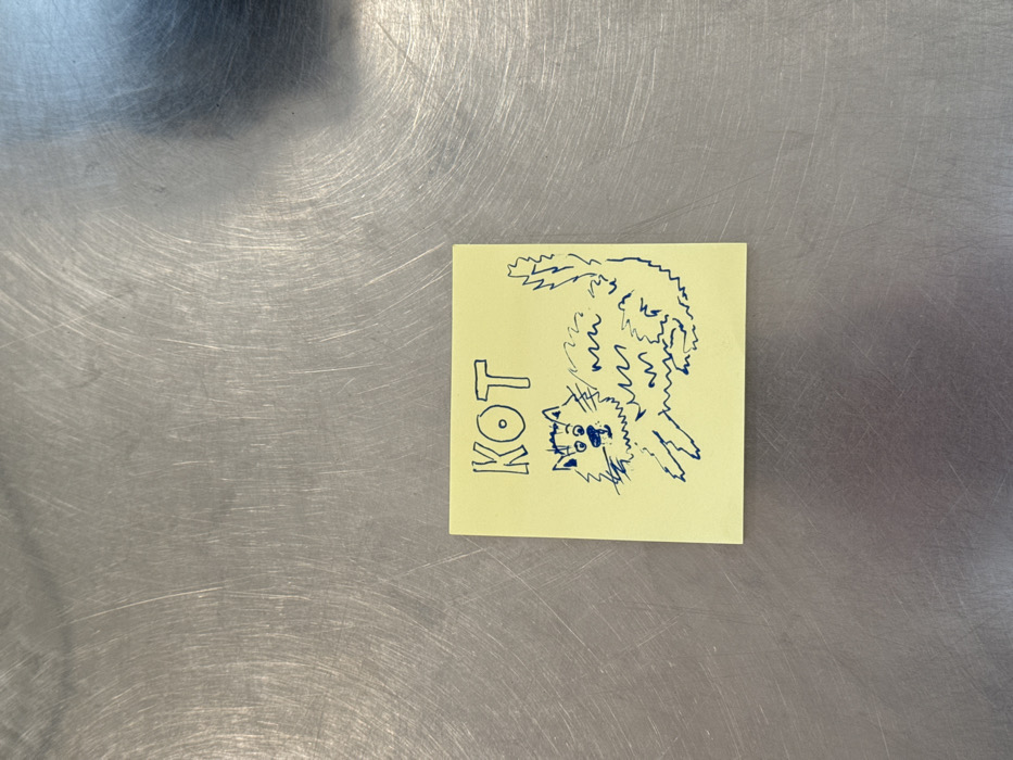 The image presents a single square yellow sticky note centrally placed on a brushed metallic surface. The note features a hand-drawn illustration rendered in blue ink, depicting a stylized, fluffy cat with whiskers, prominent eyes, an open mouth, and a bushy tail. The cat appears to be in motion, with its front paws extended. Above the drawing, the word "KOT" is printed in blue capital letters. The metallic background exhibits a texture consistent with brushed stainless steel, characterized by fine, multidirectional scratch patterns and subtle reflections of ambient light. No individuals, further objects, actions, or interactions are visible. This scene is located in the city of Tel Aviv-Yafo, Israel.