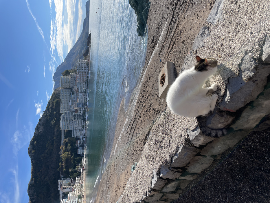 The scene depicts a coastal environment in Rafailovići, Montenegro, under bright daylight with a clear blue sky. In the foreground, a domestic cat is positioned on a low stone wall. The cat has a predominantly white body, a dark brown and white patterned head, and a striped tail; its head is lowered, indicating it is eating or sniffing small, light-colored granular material scattered on the wall's surface. To the immediate right of the cat and the wall, a square concrete block with a circular metal grate is visible on the reddish-brown sandy beach. The midground features the calm, turquoise-blue sea. Across the bay, numerous multi-story white buildings line the distant coastline, situated at the base of a large, dark green, tree-covered mountain. Additional mountains are visible further in the background, and several small watercraft are moored in the bay.