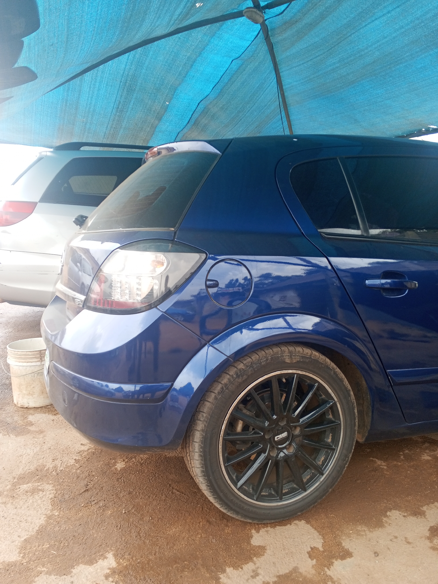The scene depicts an outdoor vehicle service area in Gura Top, Nigeria. A dark blue hatchback, likely an Opel Astra H, is positioned prominently in the mid-ground, observed from its rear three-quarter left side. The vehicle features dark-tinted windows, a polished finish reflecting the sky and surroundings, an integrated rear spoiler, and multi-spoke black alloy wheels with "CMS" branding. Directly behind it, partially obscured, is the rear section of a lighter-colored SUV or minivan, equipped with roof rails. Overhead, a large, light blue mesh shade net is stretched, diffusing ambient daylight. The ground beneath the vehicles is composed of uneven, light brown soil and dirt, exhibiting several wet patches. To the immediate left of the blue hatchback's rear bumper, two light-colored plastic buckets are stacked on the ground. No individuals are visible, and no active interactions are taking place.