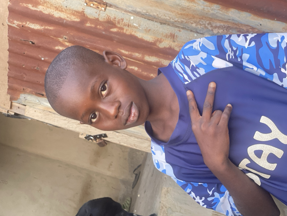 A young boy with a shaved head looks at the camera, holding up his hand in a "rock on" gesture. He wears a blue athletic shirt with blue camouflage accents on the shoulders. A section of rusted metal sheeting forms the background, partially obscuring a pale wall with a padlock. The lighting is bright, and the image is taken at an angle. A black object is partially visible at the bottom of the image.