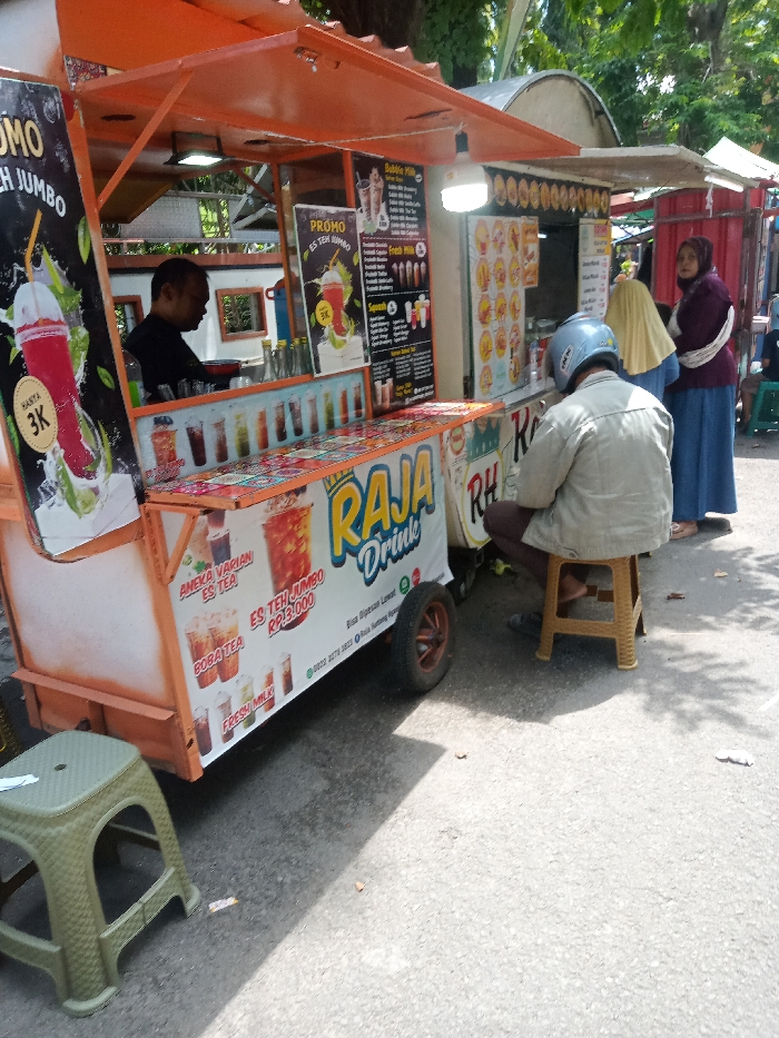 - "An outdoor scene in Nganjuk, Indonesia, depicts a brightly colored orange mobile beverage stall named "Raja Drink" situated on an asphalt pavement" by FM-ZmuuT2, licensed under CC BY 4.0