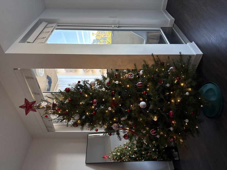 - "A Christmas tree, adorned with red and white ornaments and string lights, stands indoors near a window offering a view of exterior buildings and the sky" by FM-zH4kC3, licensed under CC BY 4.0
