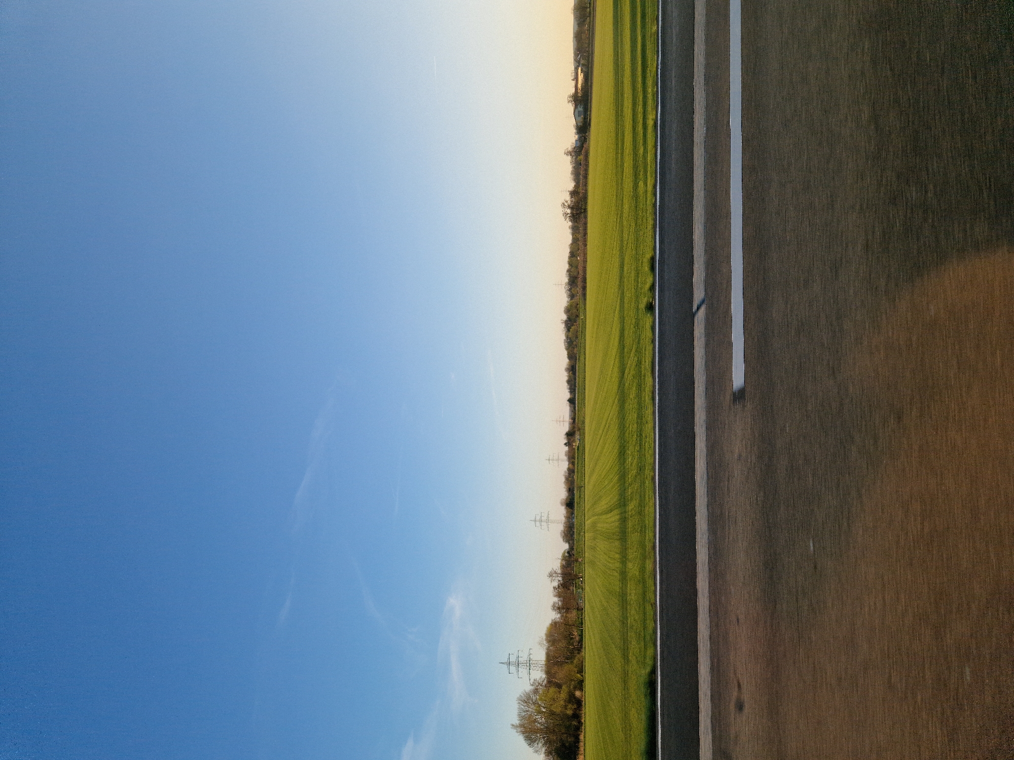 The image displays a rural landscape in Bischofsheim, Germany, under a clear, bright blue sky with subtle wisps of white cloud, characteristic of late afternoon or early evening lighting. The foreground, occupying the lower two-fifths of the frame, consists of a textured dark asphalt surface, possibly a road or railway trackbed, with a horizontal light gray concrete barrier separating it from the midground. A thin white line is painted along the top edge of this barrier. Beyond the barrier, a wide, vibrant green cultivated field dominates the midground, featuring distinct parallel crop rows and visible elongated shadows cast by low-angle sunlight from the right. The horizon line showcases a scattered arrangement of leafless deciduous trees and at least four high-voltage electricity pylons, with the largest pylon positioned on the far left. Faint, unidentifiable structures are discernible on the distant right horizon. No individuals or animals are present in the scene.