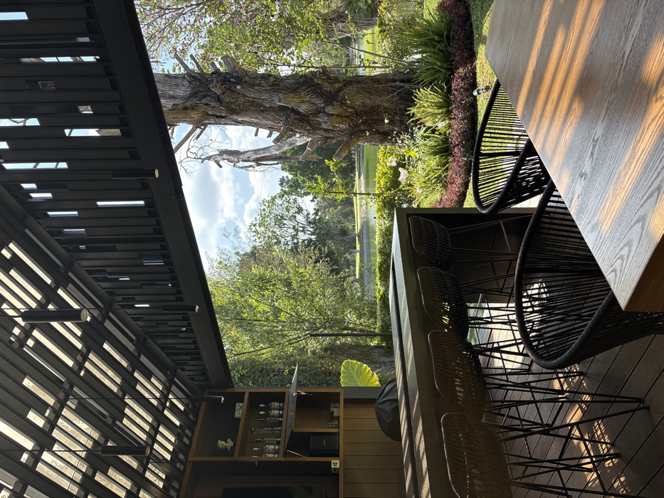 The image depicts a contemporary covered patio area overlooking a natural landscape in Irapuato, Mexico. The foreground features a dark wooden deck floor with prominent light and shadow patterns cast by the overhead structure. A long, dark-toned bar or counter with a flat surface extends from the left mid-ground, fronted by at least four black, woven-material bar stools with thin metal legs. To the far right in the immediate foreground, a corner of a dark wooden table is partially visible, alongside an additional black woven chair. The interior background on the left consists of a dark wood-paneled wall with integrated shelving, displaying multiple clear bottles, a white classical-style bust, and other small decorative items. The overhead structure is a dark, slatted design incorporating translucent panels and multiple black cylindrical pendant lights. Beyond the patio, an expansive outdoor scene unfolds under a partly cloudy blue sky. A large, prominent, gnarled tree trunk with a light-colored bark, appearing dormant or dead with numerous bare, twisted branches, stands in the mid-ground to the right. Lush green trees with dense foliage are visible across the background, and a body of water, identified as a lake or large pond, reflects the sky in the mid-distance. The area directly outside the patio is meticulously landscaped with green shrubbery, varied plants, and scattered flowering elements. No individuals are present in the scene, and no discernible actions or interactions are occurring.