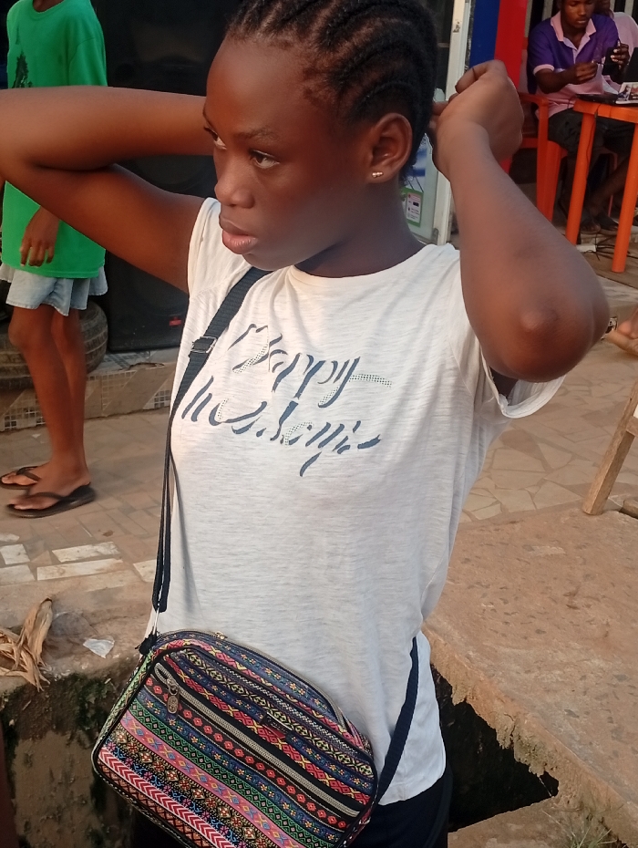 The image depicts an outdoor scene in Umuode, Nigeria. In the foreground, a young female with dark skin and braided hair stands, turned slightly to her left. She wears a white short-sleeved t-shirt with dark blue script lettering, dark trousers, and small stud earrings. A multi-colored crossbody bag with intricate geometric patterns (red, blue, green, yellow, pink, white, black) hangs from her right shoulder. Her hands are raised to the back of her head, and her gaze is directed off-frame to the left. In the midground to the left, a second individual is partially visible from the waist down, wearing a green t-shirt, light blue shorts, and black flip-flops. A dark object, possibly a large speaker or tire, is behind them. In the background to the right, a male individual in a purple collared shirt is seated at a small orange plastic table, looking down at an object in his hands. He is positioned in front of a building wall featuring vertical red and blue stripes. The ground consists of an uneven concrete or paved surface, with an open drain or gutter running along its edge, containing some dried plant debris.