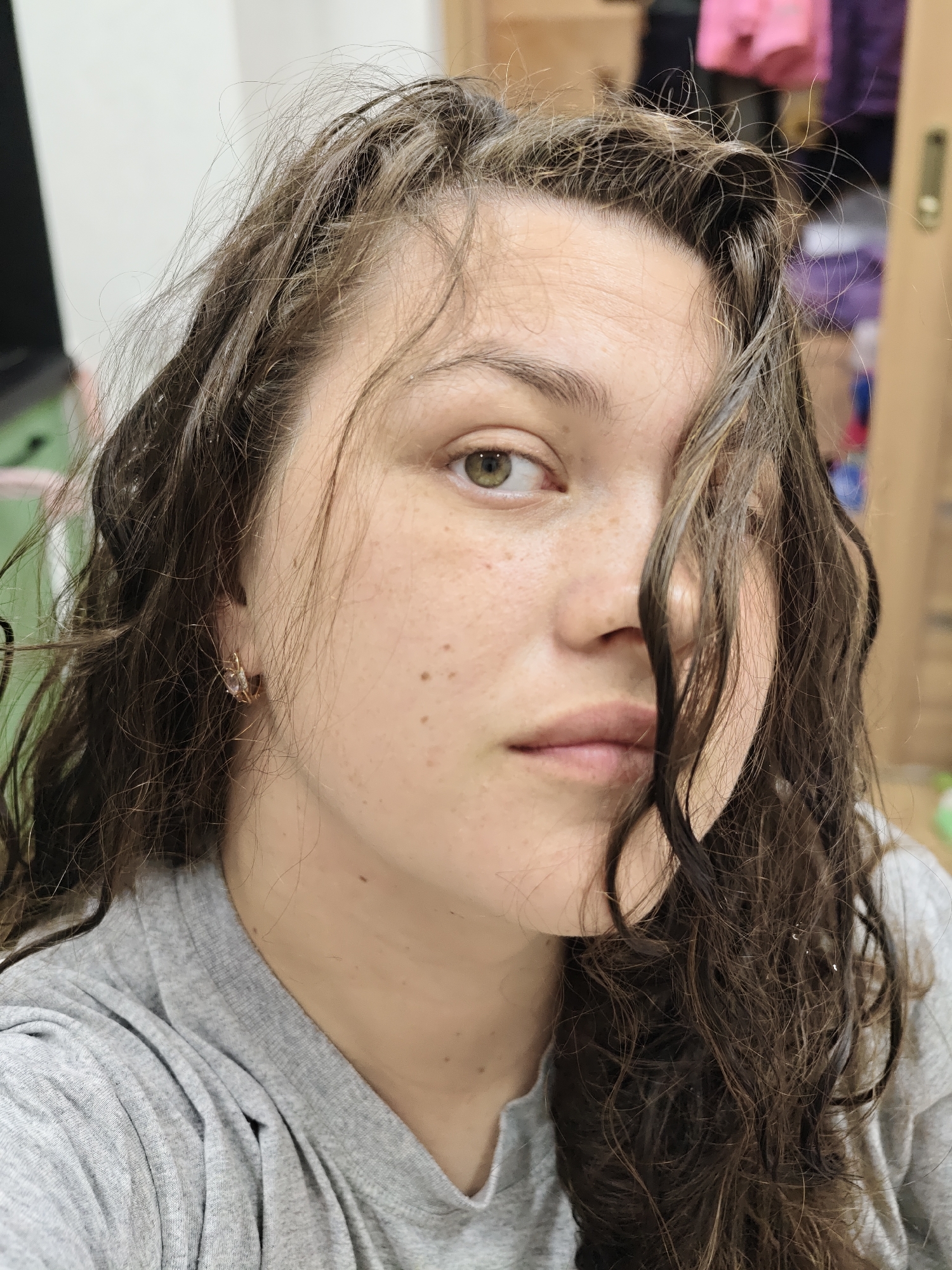 A close-up, high-angle selfie depicts a young woman with fair skin, freckles, and green eyes. Her brown, curly hair is slightly disheveled, with strands falling across her face. She is wearing a light gray t-shirt and gold earrings. The background appears to be a cluttered room with items partially visible, including what appears to be a door, a television screen, and clothing. The location is unknown, but the request implies it may be Chaikovsky, Russia.