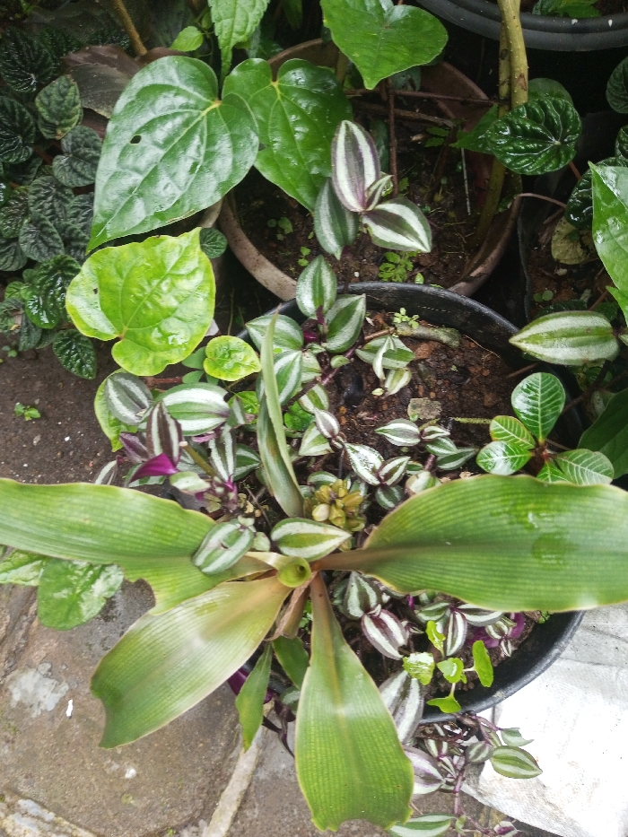 The image displays a top-down view of an outdoor collection of potted plants located in Khammam, India. No individuals are present. The scene is dominated by various green foliage. Centrally positioned, a plant with broad, elongated, ribbed green leaves shows a crescent-shaped tear on the edge of one lower leaf; a cluster of developing yellowish-green flower buds is visible near its base. Numerous *Tradescantia zebrina* (wandering Jew) plants with distinctive silver-green and purple-striped leaves are arranged throughout the frame, growing in dark-colored plastic pots containing dark soil. In the upper left, two large, glossy, heart-shaped green leaves, one with a small circular perforation, are discernible. Additional smaller green plants with varied leaf textures are interspersed among the primary subjects. The ground beneath and between the pots consists of dark soil and irregular light-colored paving stones. Moisture droplets are visible on some leaf surfaces.