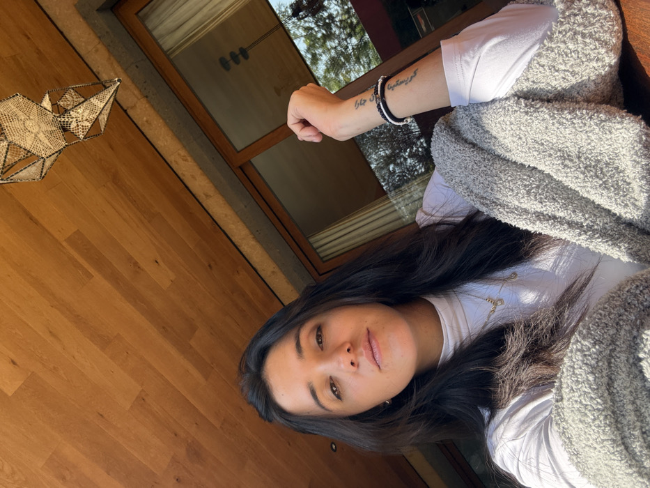 A woman with dark hair and olive skin looks directly at the camera. She wears a white shirt and a gray, textured cardigan. Her left arm is raised, revealing two bracelets and a tattoo. Behind her is a window reflecting a green leafy tree and a wooden wall. A geometric light fixture is visible in the upper left corner. The background suggests an indoor setting with natural light filtering through the window.