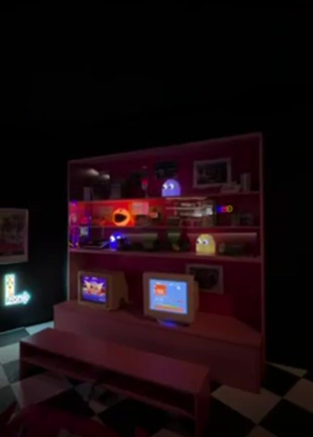 The video displays a retro-themed room with a prominent pink shelf filled with various items. Among them are glowing Pac-Man ghost figures and other nostalgic objects. Two vintage televisions sit on a pink platform below the shelf, both displaying animated graphics, including a possible Super Mario-style game. A checkered black and white floor adds to the retro aesthetic of the room. A red object, possibly a beanbag chair, is visible in the foreground. The environment is predominantly dark, highlighting the glowing elements of the display.