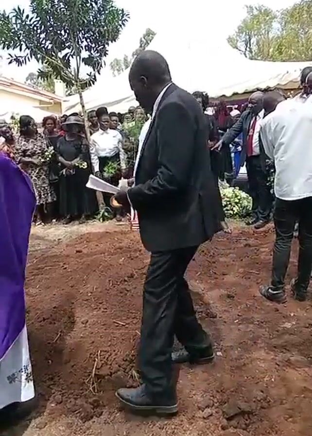 funeral. A man in a black suit stands near an open grave with a cross on a small wooden stand at the head of the grave. He appears to be reading from a piece of paper. Another man in a purple robe stands to the side of the grave. A crowd of people, many dressed in black, stand behind them. A white tent can be seen in the background. A man uses a shovel to put dirt into the grave.