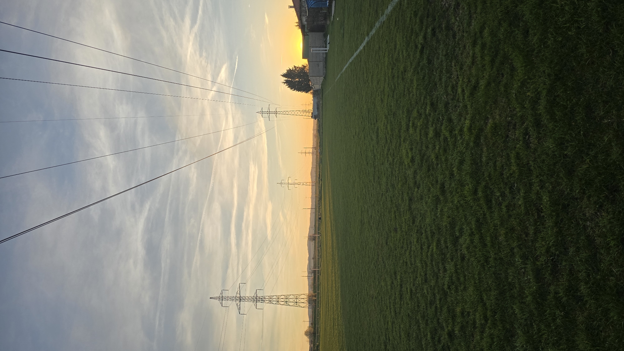 The image captures an agricultural field near Mramor, Bulgaria. The focus is a grassy field with a white sideline marking the boundary. Adjacent to the field are a few structures that appear to be buildings. Transmission towers with power lines are prominent in the scene, stretching across the sky, which is characterized by a blend of blue and orange hues suggesting either sunrise or sunset, with contrails visible. The sky conditions indicate the presence of aviation traffic.