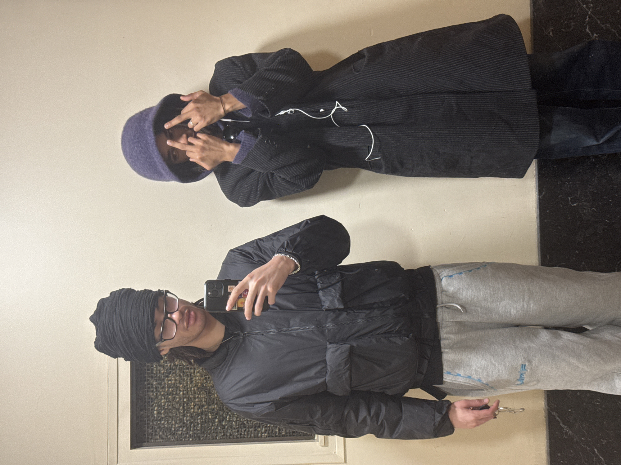 Two individuals are visible in what appears to be a mirror selfie. The person at the bottom of the image is wearing a black head covering, glasses, a black jacket, and gray sweatpants. They are holding a smartphone in their right hand, seemingly taking the picture. The person at the top of the image is wearing a hooded purple garment and a black corduroy coat. They are holding up their hands in front of their face. The background consists of a plain white wall with a darker marble panel below. The location is not identifiable as Paris, France from the available visual information.