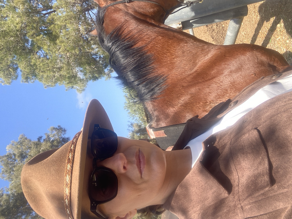 This image captures an outdoor scene in the Yoav Regional Council, Israel. The primary subject is an adult female, positioned in a close-up, angled slightly towards the left. She wears a light brown wide-brimmed felt hat with a braided band and dark, square-framed sunglasses. Her attire consists of a brown, long-sleeved collared shirt or jacket over a white t-shirt. To her right, a brown horse stands, partially visible, with a dark mane and what appears to be part of a saddle pad or blanket on its back, along with a dark halter or bridle strap near its head. The background features a clear blue sky, several green trees, and indications of a dirt ground. A gray metal fence or post is partially visible behind the horse. The scene is brightly illuminated by direct sunlight.