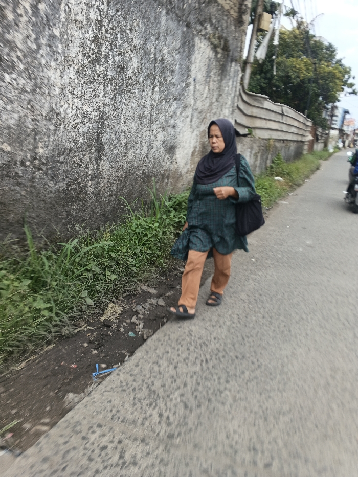 - "An adult individual, dressed in a dark hijab, a green plaid tunic, light brown trousers, and black sandals, walks on the left edge of a paved road in Margahayu, Indonesia" by FM-rgG523, licensed under CC BY 4.0